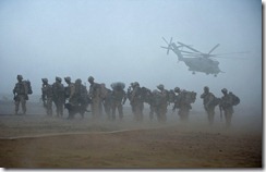 Above U.S. Marines from the 2nd Battalion, 8th Marine Regiment of the 2nd Marine Expeditionary Brigade wait for helicopter transport as part of Operation Khanjar at Camp Dwyer in Helmand Province in Afghanistan on July 2, 2009.